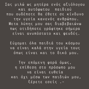 ”Σας μιλώ ως μητέρα ενός αξιόλογου και αυτόφωτου παιδιού που ουδέποτε θα έθετε σε κίνδυνο την υγεία κανενός ανθρώπου. Μετά λύπης μου σας διαβεβαιώνω πως οτιδήποτε γράφτηκε σήμερα είναι ανυπόστατο και ψευδές. Εύχομαι όλα τα παιδιά του κόσμου να είναι καλά στην υγεία τους όπως είναι και το δικό μου. Την επόμενη φορά όμως , η επίθεση να είναι ευθεία και όχι μέσω των παιδιών μου, ξέρετε εσείς.-”