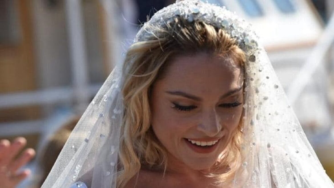 Η απαστράπτουσα νύφη έφτασε στην εκκλησία σε ένα στολισμένο καϊκι συνοδευόμενη από τον μπαμπά της Γιάννη Ζουγανέλη.