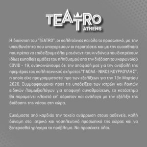 “Η διοίκηση του “TEATRO” , οι καλλιτέχνες και όλο το προσωπικό , με την υπευθυνότητα που υπαγορεύουν οι περιστάσεις και με την ευαισθησία που πρέπει να επιδείξουμε όλοι μας έναντι του κινδύνου που διατρέχουν ιδίως ευπαθείς ομάδες του πληθυσμού από την διάδοση του κορωνοϊού COVID-19 , ανακοινώνουμε την απόφαση μας για την αναβολή της πρεμιέρας του καλλιτεχνικού σχήματος “ΠΑΟΛΑ – ΝΙΚΟΣ ΚΟΥΡΚΟΥΛΗΣ” , η οποία είχε προγραμματιστεί προ των εξελίξεων για την 13η Μαρτίου 2020. Συμμορφωμένοι προς τις υποδείξεις των ιατρών και λοιπών ειδικών λοιμωξιολόγων για αποφυγή συναθροίσεων , το κατάστημα θα παραμείνει κλειστό επ΄αόριστον και ανάλογα με την εξέλιξη της διάδοσης της νόσου στη χώρα.